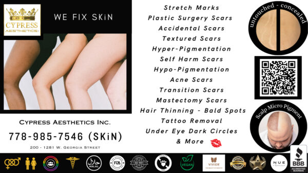 Voted Vancouver’s Best Paramedical Scar & Stretch Mark clinic, Cypress Aesthetics Inc. is dedicated to providing specialized services such as treating scars, stretch marks, acne scars and skin discolorations. Their mission is to empower clients by enhancing their skin’s appearance, ultimately restoring their confidence and self-esteem, believing everyone deserves to feel comfortable and proud in their own skin.
