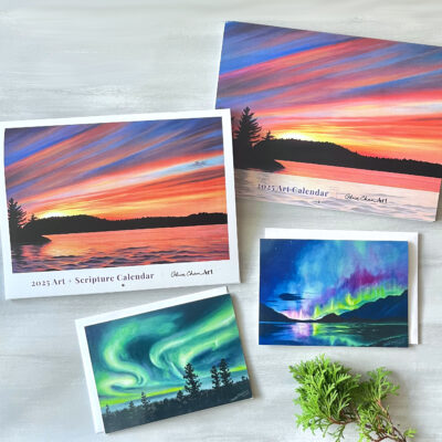 Olive Chan Art offers 2025 calendars featuring 12 original paintings of landscapes and skies to bring beauty and calm throughout the year. Her calendars are available with or without Bible scripture verses. She also has packs of ‘Northern Lights’ greeting cards, inspired by her experience of seeing them earlier this year.