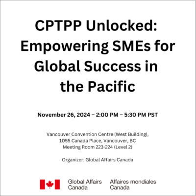Join us for CPTPP Unlocked: Empowering SMEs for Global Success in the Pacific on Tuesday, November 26, 2024, at the Vancouver Convention Centre. This business event is designed to equip small and medium-sized enterprises (SMEs) with the tools to harness the benefits of the Comprehensive and Progressive Agreement for Trans-Pacific Partnership (CPTPP), a trade bloc involving Canada and 11 other countries in the Indo-Pacific. Participants will enjoy insightful panels, plus valuable in-person networking opportunities with senior trade officials, business leaders, and key representatives from CPTPP member countries, all aimed at unlocking new market opportunities for global success.