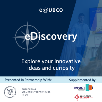 eDiscovery is a dynamic 8-week program delivered on a set of foundational workshops designed for UBCO students, faculty, staff, alumni, researchers and the broader Okanagan community to transform their innovative ideas into sustainable impact.