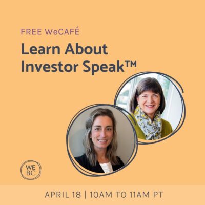 WeBC is working to help more women overcome this barrier to equity financing, through our Investor Speak™ program, which teaches women how to lead the conversation. Participants practice on their own time for 15 minutes a day, then join weekly meetups with the group to receive group support on their venture capital journey.