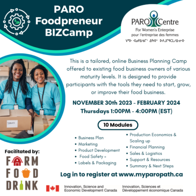 WeBC is currently partnering with PARO, an organisation supporting Women entrepreneurs in Ontario on a new cross-Canada project they have started. As a part of this project, they will be running a 10-week Foodpreneur BizCamp (similar to WeBC’s Peer mentoring groups) for Foodpreneur product producers who are established on a small scale but looking to scale up to provide to larger food retailers. The BIZCamps will start Nov 30 (with breaks for the Holiday season). The BIZcamp is free for participants, but numbers are limited.