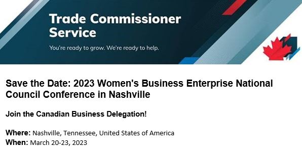 Join the Canadian Business Delegation! Where: Nashville, Tennessee, United States of America When: March 20‑23, 2023 The Trade Commissioner Service (TCS) at the Consulate General of Canada in Atlanta is recruiting Canadian women‑owned businesses to participate in a business delegation to the Women's Business Enterprise National Council (WBENC) Conference in Nashville, Tennessee. WBENC is an […]