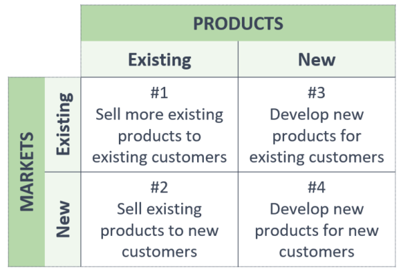According to this framework, growth strategies can be organized into a matrix, with products (what you sell) on one side, and markets (who you sell to) on the other.