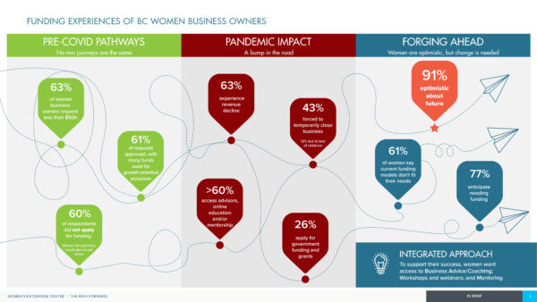- Understand the past (Pre-Covid), present (Covid) and future funding journeys of women entrepreneurs in BC, so we can identify gaps and opportunities to support their future needs; and