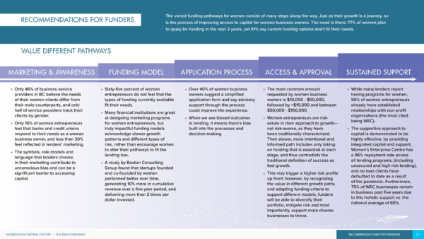 - NEW FUNDING MODELS ARE NEEDED TO ENCOURAGE DIVERSITY AMONG ENTREPRENEURS. Sixty-one percent of women say current funding models don’t fit their needs. About one-third of requests for Non-WeBC funding in the past three years were declined, and 28% of Non-WeBC-Funded women have not applied for funding because they feel they wouldn’t qualify.