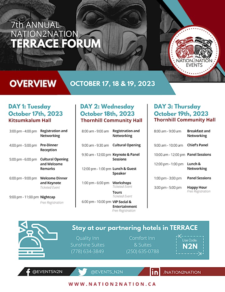 Thornhill Community Centre 3091 Century St, Thornhill, British Columbia, CanadaNATION2NATION COMMUNITY SESSIONS The goal of the Forum is to bring together First Nations, Government, Industry & community leaders to continue the conversation about economic development & doing business with First Nations. Registration is open for both sessions. All the details can be found at: https://events.eply.com/Nation2Nation TERRACE , BC SEPTEMBER 21 & 22, 2022 Thornhill […]