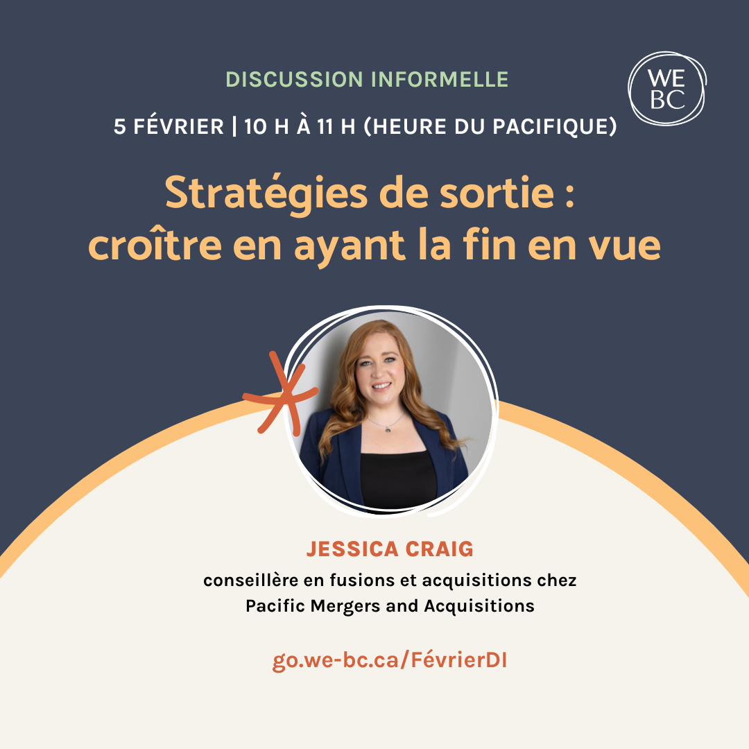 Rejoignez WeBC le 5 février pour une discussion informelle avec Jessica Craig, experte en fusions et acquisitions.