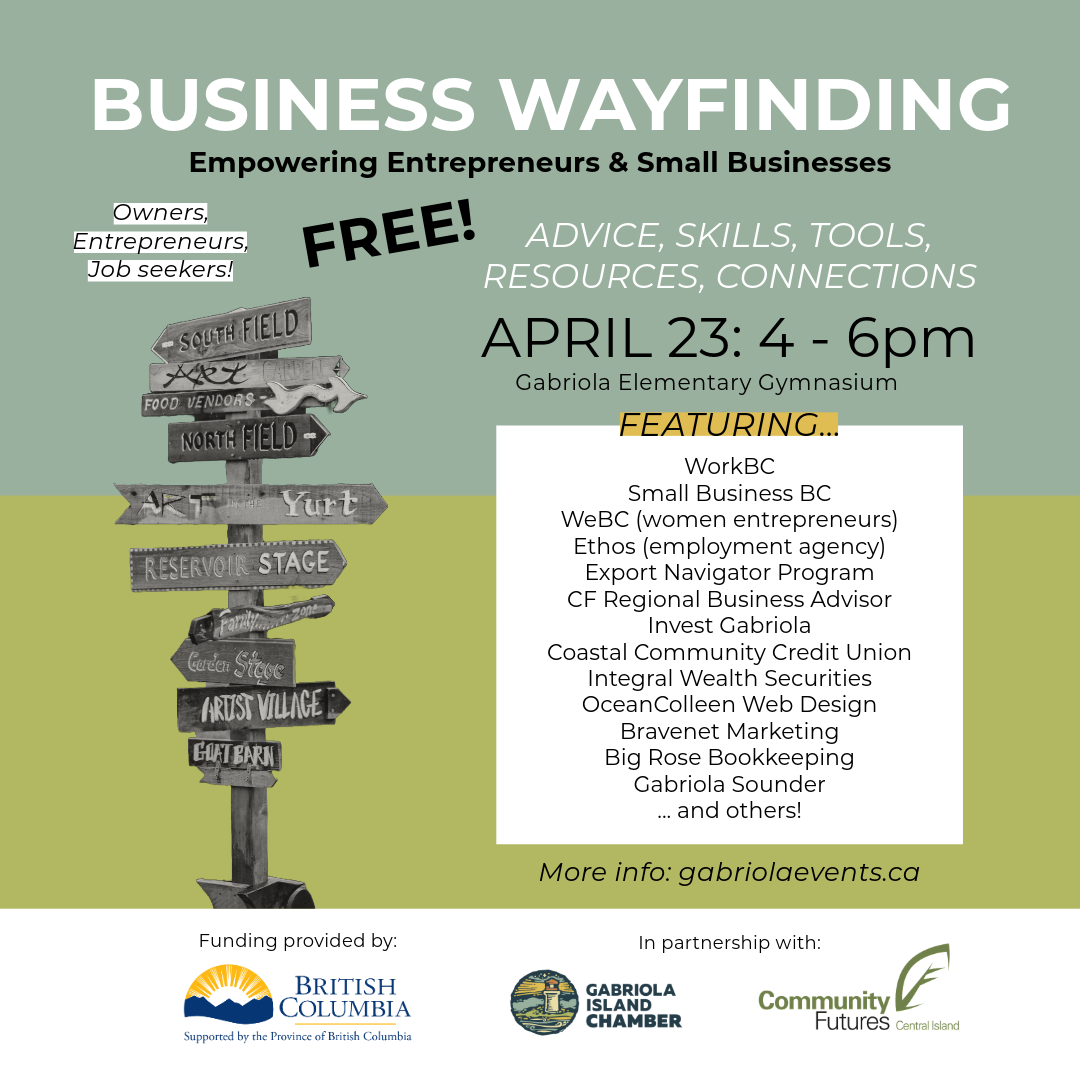 680 N Rd, Gabriola, BC V0R 1X3 680 N Rd, Gabriola, bc, CanadaJoin us in partnership with Community Futures Central Vancouver Island on April 23 for "Business Wayfinding"! This free event offers advice, skill-building, resources, and connections for job seekers, business owners, island entrepreneurs, and organization leaders. Our Business Advisor, Kelly Masson, will join other local experts and community partners from 4 pm to 6 pm at […]