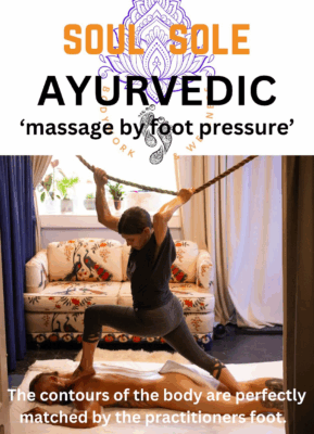 I provide a unique and highly effective massage therapy treatment, in which I use my feet to massage my clients. This modality of massage is an ancient Ayurvedic treatment from the south of India. It allows the practitioner to do long sweeping massage strokes that span the whole body. This helps the body to relax and receive deeper tension release. The practitioner can distribute weight and pressure depth by use of a rope hung overhead. The treatment actually stretches the muscles and can penetrate as deeply or as gently as the client prefers. The foot perfectly matches the contours of the body’s muscles, allowing for ease of tension release.