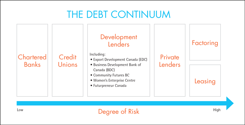 Below is a diagram that explains how the lenders differ, with regard to risk. The Biannual Survey of Suppliers of Business Financing, compiled by Statistics Canada, also gives a good overview of lending conditions in Canada. Or, learn about the Financing Continuum and the Business Life Cycle.
